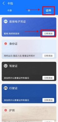 (四)通過支付寶激活。打開支付寶首頁點(diǎn)擊“卡包”,選擇證件,點(diǎn)擊添加“醫(yī)保電子憑證”;進(jìn)行刷臉實(shí)名認(rèn)證激活醫(yī)保電子憑證。