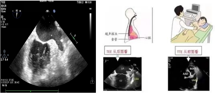 左心耳位于左心房的偏后上部分,大部分情況下被左心房主體部分遮擋,常規(guī)的經(jīng)胸超聲心動圖(TTE)很難清晰顯示。TEE是超聲探頭置入食道內(nèi),從心臟的后方進(jìn)行檢查,縮短了超聲探頭與心臟及距離,避免了肺氣干擾、肋骨遮擋等弊端,可直觀的從左心房看到左心耳,排查左心耳內(nèi)有無血栓。目前我院開展了常規(guī)經(jīng)食道超聲心動圖和無痛經(jīng)食道超聲心動圖檢查。