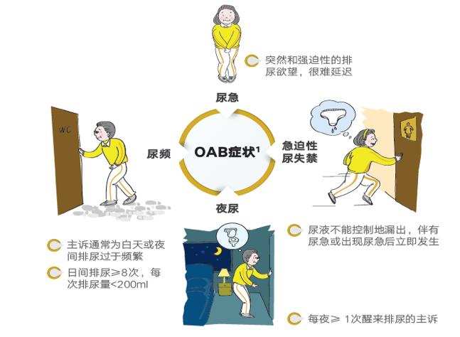 ④. 膀胱過度活動(dòng)癥。又叫作OAB,一種以尿急癥為特征的癥候群,常伴有尿頻和夜尿癥狀,伴或不伴有急迫性尿失禁,沒有尿路感染或其他明確的病理改變。通俗地說,就是膀胱不受控制的過度活動(dòng),從而引起不停地上廁所,嚴(yán)重時(shí)甚至尿失禁。