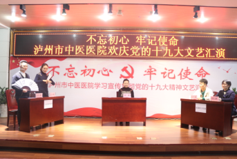 黨的十九大勝利召開了,市中醫(yī)醫(yī)院人為之振奮,深受鼓舞!為深入學(xué)習(xí)宣傳貫徹黨的十九大精神,特別是習(xí)近平新時(shí)代中國特色社會主義思想,教育引導(dǎo)全院廣大黨員干部群眾自覺把思想和行動統(tǒng)一到十九大精神上來,12月15日下午,我院黨委在門診11樓學(xué)術(shù)廳舉辦主題為“不忘初心,牢記使命-——?dú)g慶黨的十九大文藝匯演”活動。市衛(wèi)生計(jì)生委領(lǐng)導(dǎo)、全院中層及以上干部、全體黨員、入黨積極分子觀看了演出。